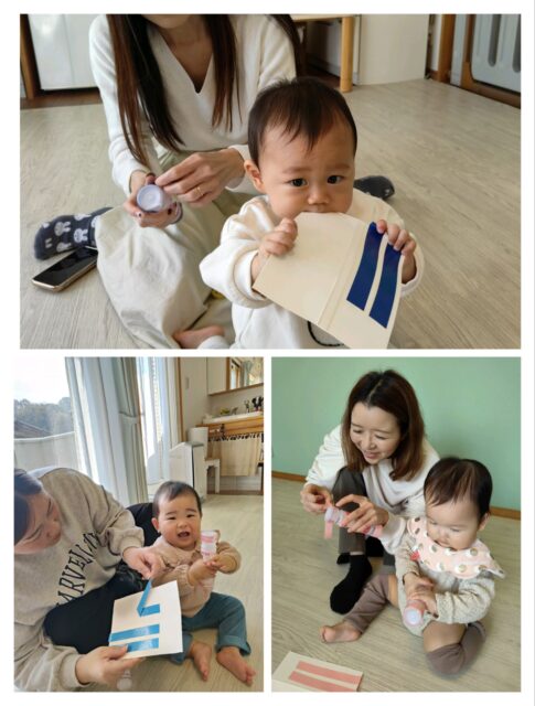 こちらは台紙の牛乳パック や ガラガラに興味津々で…