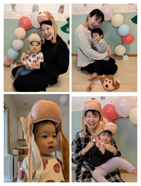 月齢フォトのサンタ帽子はイヤだけどおさる帽子を受け入れられるTちゃんでした(*^^*)