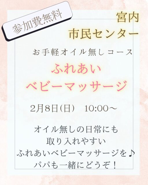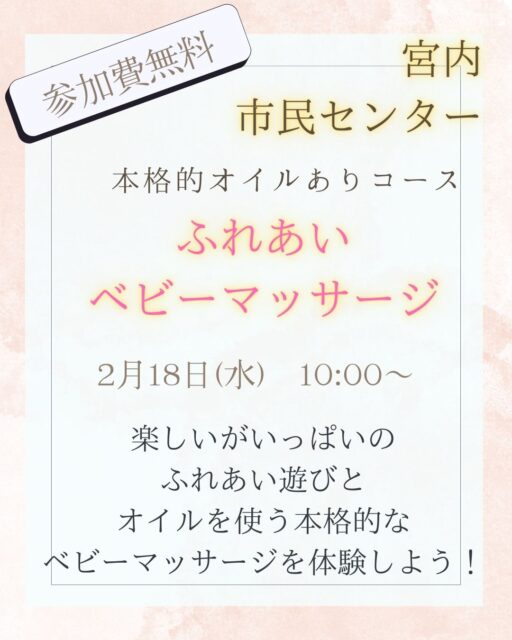 こちらは平日という事もあり主にママさんや赤ちゃんで本格的なオイルを使うベビマを一緒に楽しんでいけれたらと思っております(^-^)